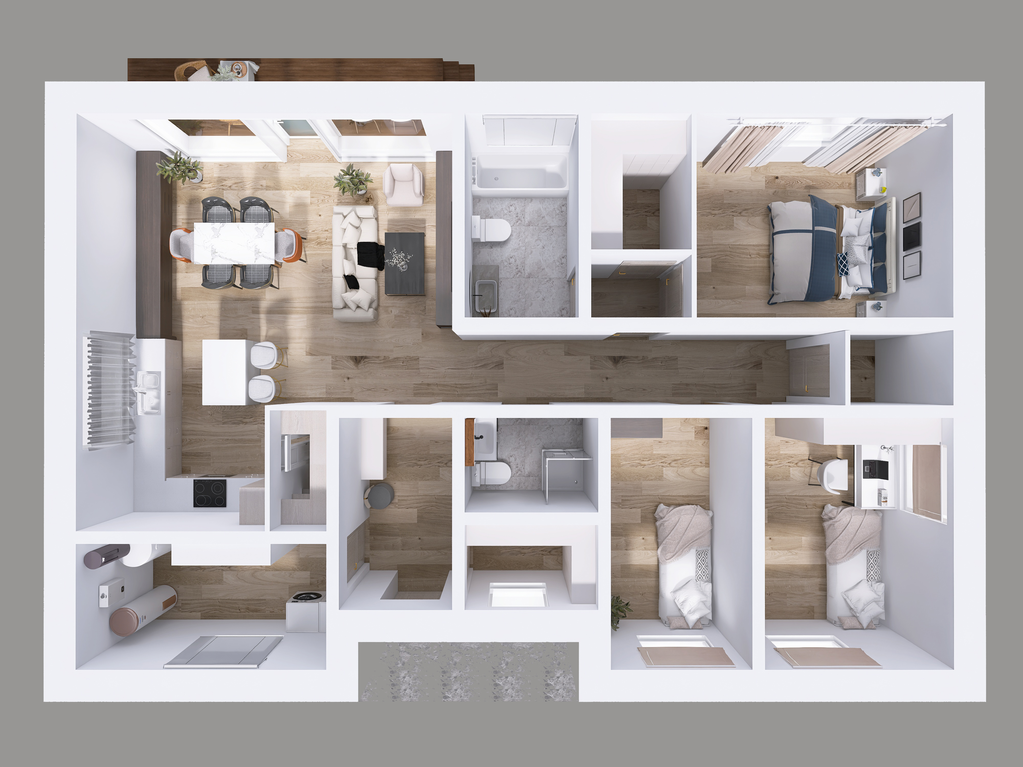 Другими словами — у вас будет своя собственная квартира в доме. Внутри спальни расположен холл, гардеробная и санузел, которыми будете пользоваться только вы. Холл служит дополнительной шумоизоляцией, можно спать в тишине.